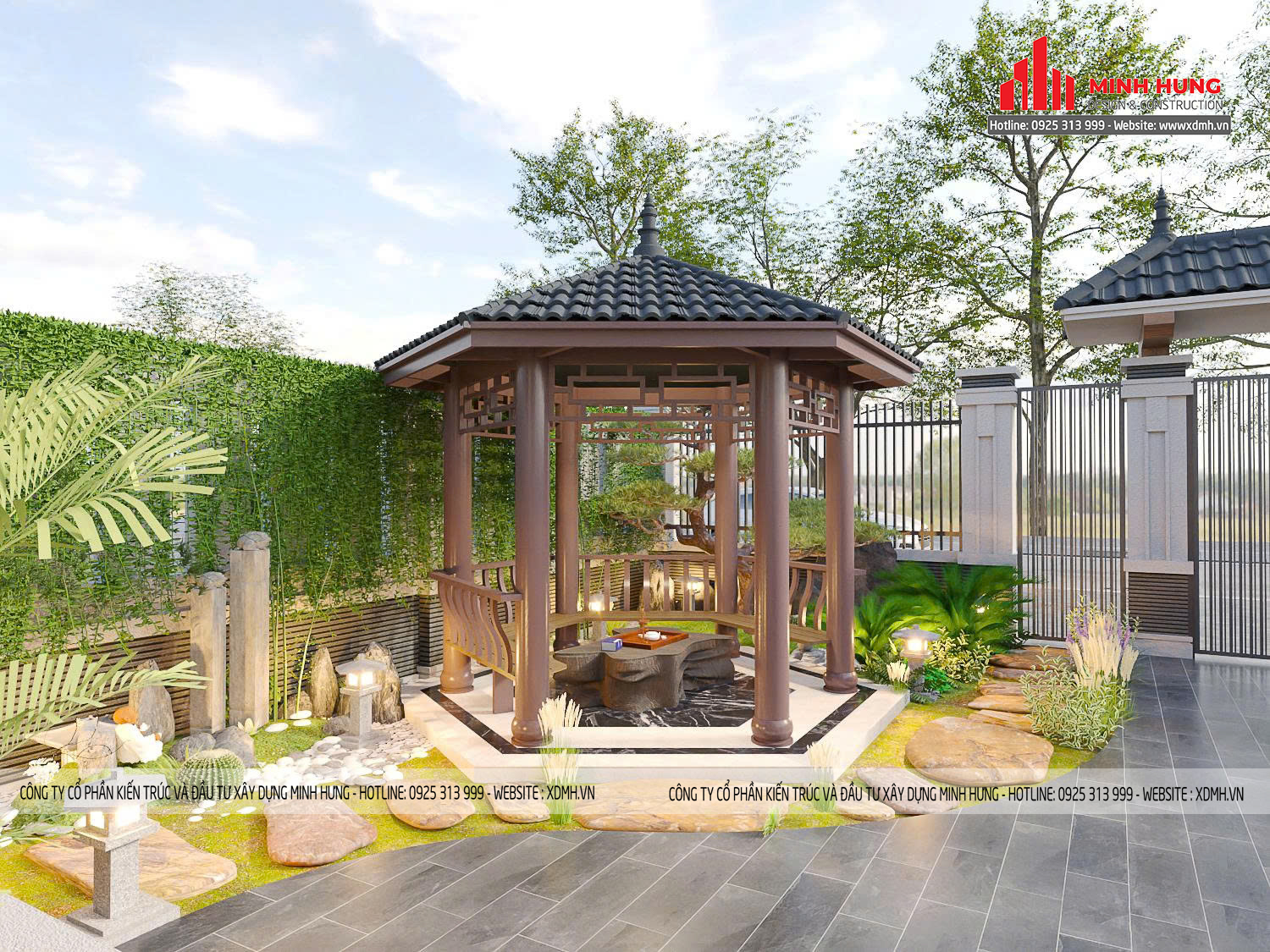 Một chòi nghỉ nhỏ trong sân là nơi dừng lại chậm rãi – uống trà, ngồi yên, hay đơn giản là ngắm nắng gió đi qua. Không cần quá nhiều chi tiết, chính sự giản dị ấy lại mang đến cảm giác đủ đầy và an nhiên cho cuộc sống hàng ngày.
